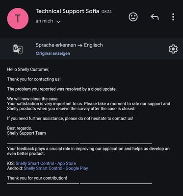 For example, when I try to switch on the light in the kitchen (Shelly 1),"Hey Google, switch on the light the kitchen", Google replies with "an error occured". Same happens, when I try to just push the tile in the Google Home app. It's the same for Shelly devices in my home. I tried to reconnect my Shelly account, but it didn't change anything.