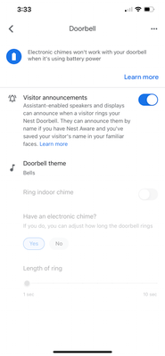 Oh. Your screen capture showed "Visitor announcements" selected, so I assumed, since visitor announcements go to Nest Hubs, Minis, and speakers, that that's what you wanted. And as I mentioned earlier, the "Ring indoor chime" option is automatically disabled when the battery doorbell is NOT wired to an indoor doorbell chime.