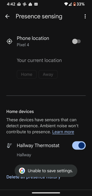 • I get "Unable to save settings" message in Google Home when attempting to enable presence sensing for the Nest Gen 4 device.